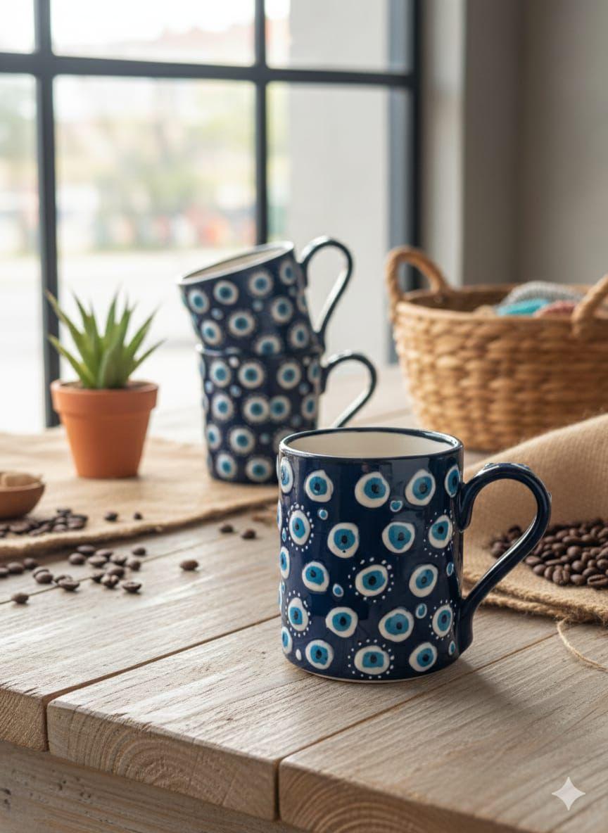 Güneşin doğuşuyla birlikte tazelenmiş bir ruhla güne başlamak ya da yorgun bir günün sonunda huzurlu bir mola vermek istediğinizde, sıradan bir kupa yerine size iyi gelecek bir dost arıyorsanız doğru yerdesiniz. Bu eşsiz el yapımı nazar boncuklu kupa, sadece bir içecek kabı değil, aynı zamanda evinize veya ofisinize pozitif enerji ve şıklık katacak bir sanat eseridir.