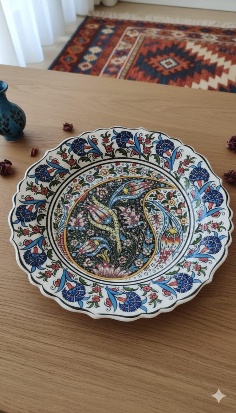İşte gördüğünüz bu tabak, Kütahya çinisi sanatının inceliklerini taşıyor. Bu tabak, göz alıcı bir dekoratif ürün olarak evinizin her köşesine zarafet katacak. Tabaktaki desen, doğal boyalar kullanılarak işlenmiş ve canlı renkleriyle öne çıkıyor. Tabakta, Osmanlı motifleri olan lale ve sümbül gibi çiçekler, soyut ve simetrik bir kompozisyonda birleşerek size özel bir görünüm sunuyor.