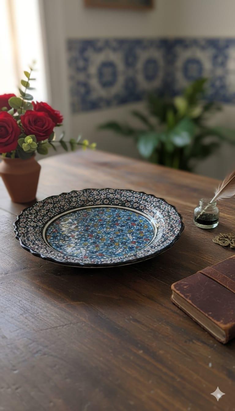 Bu eşsiz seramik tabak, ustalıkla işlenmiş el yapımı bir sanat eseridir. Derin mavi ve turkuaz tonlarındaki karmaşık desenleri, her bir noktası el emeğiyle işlenmiş ince detaylarla bezenmiştir. Tabak, hem geleneksel hem de modern dekorasyon stillerine uyum sağlayacak zamansız bir estetik sunar.