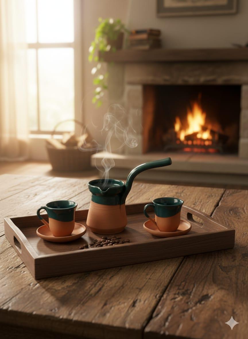 CEZVE FİNCAN TAKIMIBu zarif kahve fincanı ve cezve takımıyla kahve ritüelinizi özel hale getirin. Her bir parça, yetenekli zanaatkârlar tarafından el yapımı olarak üretilmiştir. Fincanların ve cezvenin alt kısmı, toprağın sıcaklığını ve doğallığını yansıtan sırsız seramikten, üst kısımları ise parlak, sır kaplı seramikten yapılmıştır. Bu benzersiz tasarım, hem modern hem de geleneksel estetiği bir araya getirir.