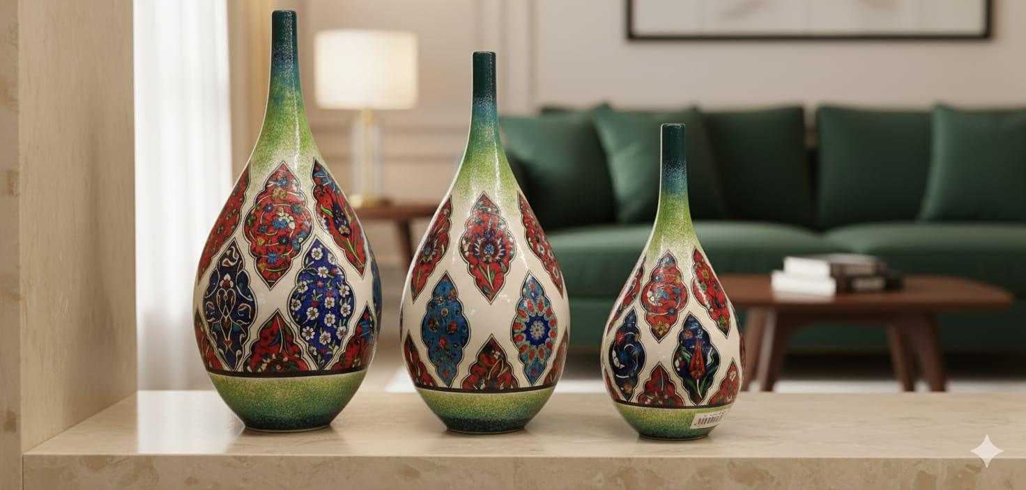 Türkiye'nin geleneksel çini sanatının modern tasarımla buluştuğu bu el yapımı vazo setiyle evinize zarif bir dokunuş katın. Anadolu'nun asırlık desenlerini taşıyan bu üç farklı boyuttaki vazo, canlı renkleri ve göz alıcı detaylarıyla yaşam alanınıza estetik bir derinlik katar. Her bir vazo, ustalıkla işlenmiş motifleriyle kendi başına bir sanat eseri niteliği taşırken, bir araya geldiklerinde kusursuz bir uyum sergiler. İster salonunuzda, ister antrenizde, isterse çalışma masanızda kullanın, bu set odanıza sanatsal bir hava katacaktır