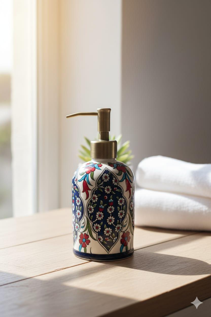 Göz alıcı mavi fon üzerine işlenmiş canlı kırmızı ve yeşil detaylar, her kullanımda evinize sanatsal bir dokunuş getiriyor. Kaliteli seramikten üretilen gövde, dayanıklılığıyla öne çıkarken, pirinç renkli pompa başlığı da ürüne modern ve şık bir görünüm katıyor.