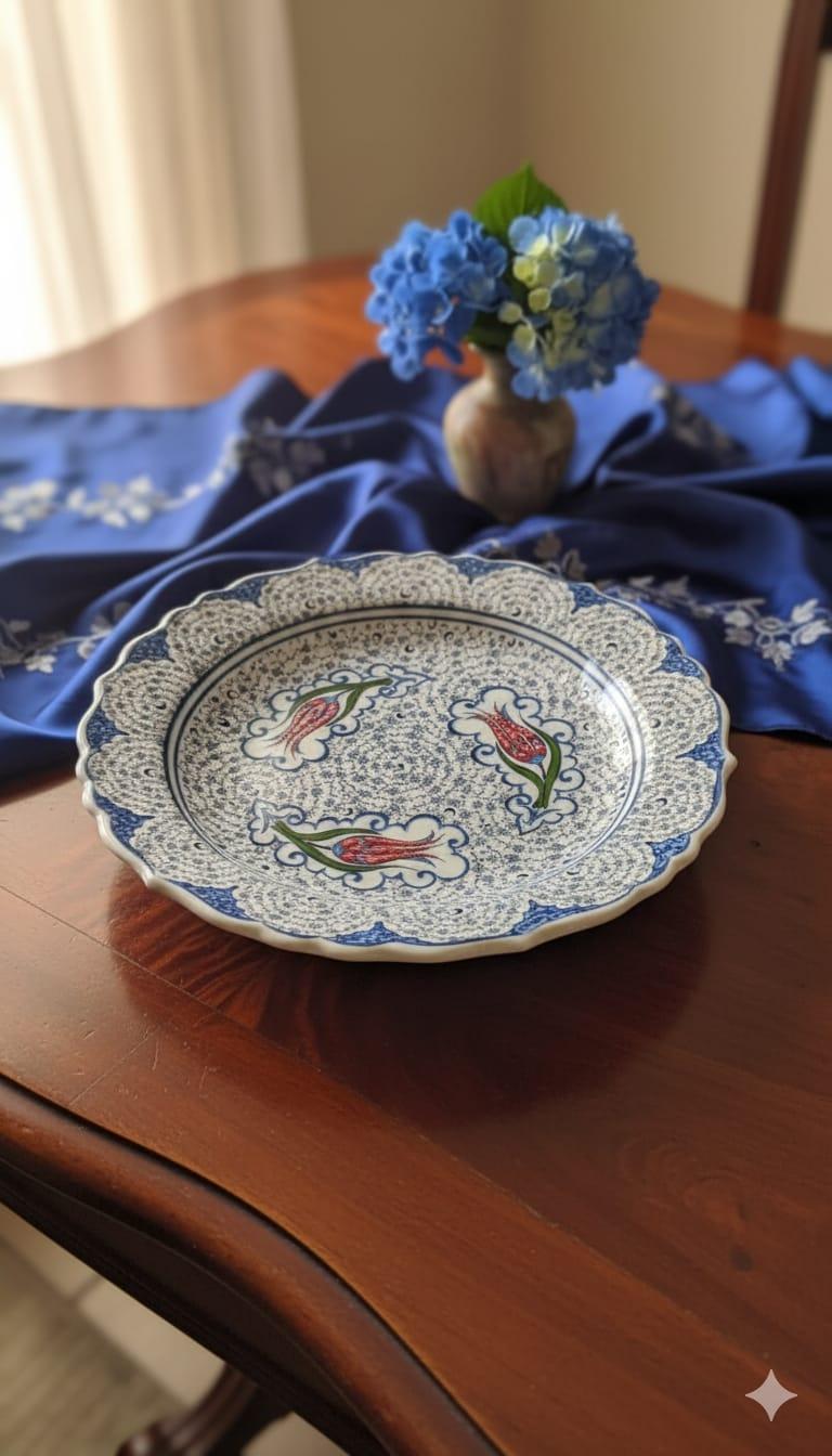 Bu el yapımı seramik tabak, geleneksel Türk sanatının zarafetini ve inceliğini sofralarınıza taşıyor. Her bir detayı özenle işlenmiş olan bu tabak, üzerindeki Kütahya çinisi sanatından esinlenmiş lale ve karanfil motifleriyle dikkat çekiyor. Lale motifi, Osmanlı ve Türk kültüründe zarafet, güzellik ve ilahi aşkı simgelerken, karanfil motifi sağlık, şifa ve bolluğu temsil eder.