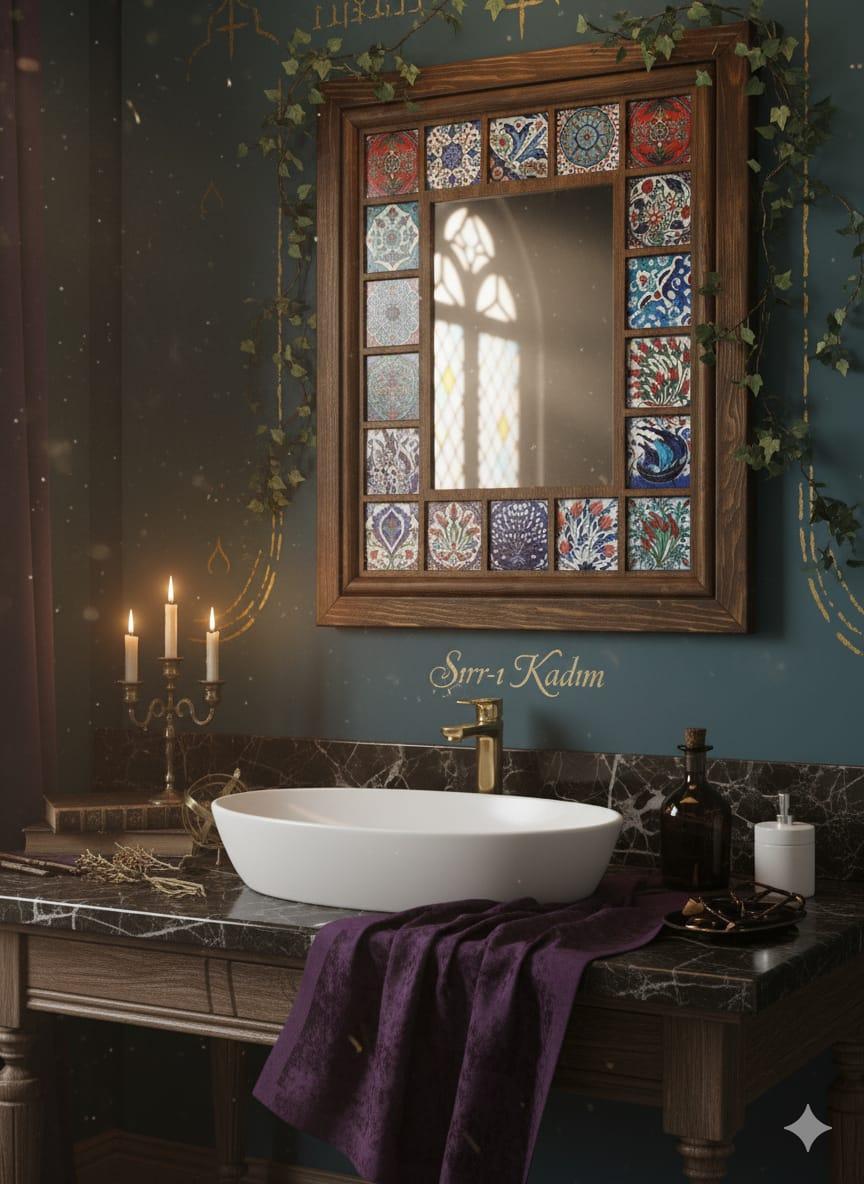 Sırr-ı Kadîm: Geleneksel Çini Motifli Ayna: Bu özel tasarım ayna, banyonuza veya makyaj masanıza geleneksel bir zarafet ve mistik bir hava katmak için tasarlandı. Sırr-ı Kadîm adını verdiğimiz bu ürün, ahşap çerçevesi ve etrafını süsleyen el yapımı çini karolarıyla dikkat çekiyor. Her bir karo, farklı desen ve renklere sahip olup, banyonuzu sıradanlıktan uzaklaştırarak kişiselleştirir.